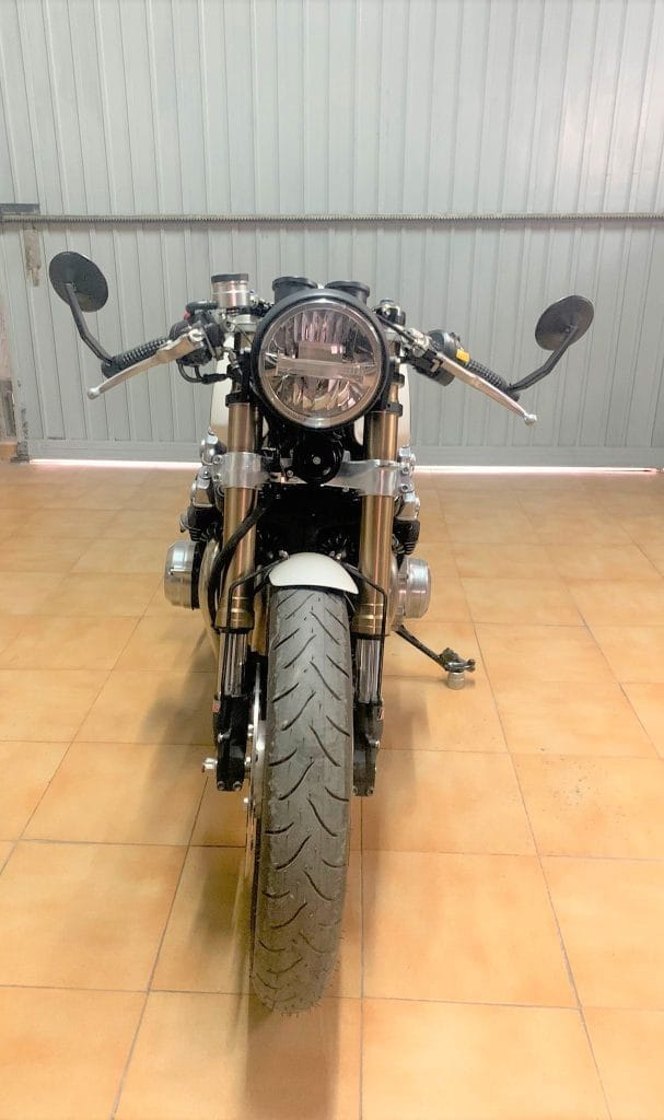 - Sustitución del manillar original por semimanillares RENTHAL de aluminio, manteniendo los mandos y empuñaduras de fábrica, reubicados para conservar la ergonomía original.