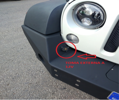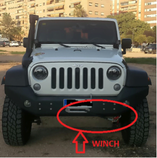 Se ha llevado a cabo una reubicación de los antiniebla delanteros originales. En nuestro JEEP hemos montado un paragolpes artesanal con una toma a 12V externa y un WINCH marca RUNVA modelo EW9500, es un dispositivo mecánico impulsado por un motor eléctrico.