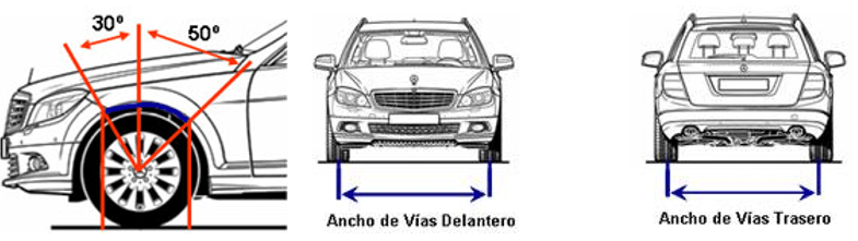 Solo nos quedará comprobar el ancho de vías. Este dato se mide de centro de neumático a centro de neumático. Muy importante que las ruedes siempre queden dentro la carrocería del vehículo. Los aletines deberán cubrir al menos 30º por delante y 50º por detrás, tal y como podéis comprobar en el siguiente croquis: