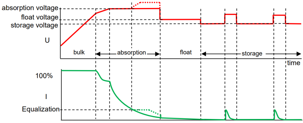 Como ya se ha visto, en los sistemas fotovoltaicos, el regulador se encarga de cargar las baterías. Sin embargo, el regulador no proporciona un flujo de corriente, sino que controla la carga de las baterías por etapas. Veamos el proceso de carga y las características de cada etapa.
